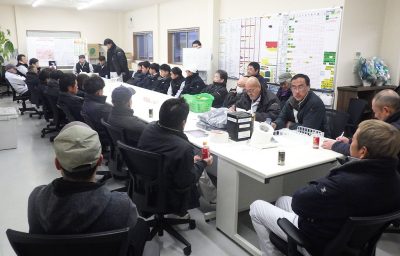 安全に工事をする為、毎月実施! 毎月第一月曜日に会議を開き、ヒヤリハットや技術内容等について話し合い、進歩に繋げております。 -