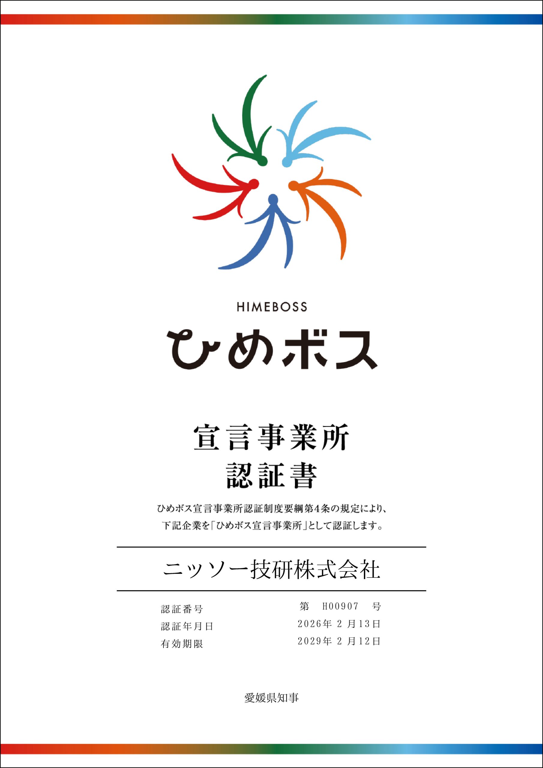 このたびニッソー技研は、愛媛県が推進する「ひめボス宣言事業所」の認証事業所となりました。